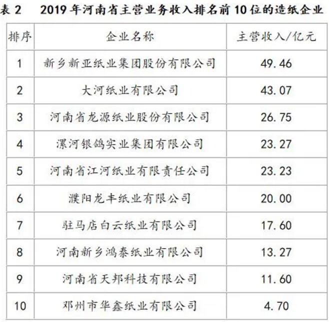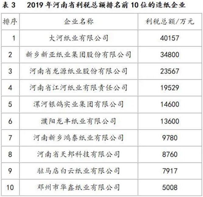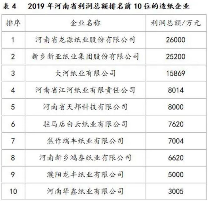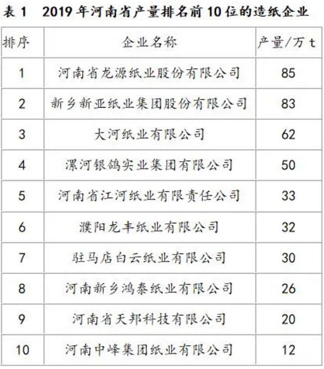 1、2019年概況 2019年是河南省造紙行業(yè)形式相對平穩(wěn)的一年,文化用紙、特種紙、生活用紙都產(chǎn)銷兩旺,包裝紙(箱紙板、瓦楞原紙)企業(yè)產(chǎn)品暢銷,原材料供應緊張。根據(jù)河南省造紙學會的調查資料,2019年河南省機制紙及紙板生產(chǎn)企業(yè)約100家,職工人數(shù)約5萬人,機制紙及紙板總產(chǎn)量386.8萬t,同比增長2.03%;主營業(yè)務收入698.5億元(包括紙制品),同比下降8.4%;利潤總額23.56億元,同比下降53.6%。與2018年相比,2019年河南省造紙行業(yè)主營業(yè)務收入、利稅都有所減少,利潤下滑明顯。 河南造紙企業(yè)主要分布在漯河、濮陽、焦作、新鄉(xiāng)、駐馬店、鄭州等地區(qū),2019年河南省造紙企業(yè)生產(chǎn)能力超過10萬t的企業(yè)有21家,占全省總產(chǎn)量的85%以上;麥草等非木纖維漿造紙產(chǎn)量約8萬t,占全省機制紙及紙板產(chǎn)量的2.06%,廢紙造紙產(chǎn)量約190萬t,占全省機制紙及紙板產(chǎn)量的49.10%;木漿造紙產(chǎn)量約189萬t,占全省機制紙及紙板產(chǎn)量的48.84%。主要產(chǎn)品中,書刊印刷紙、雙膠紙、無碳復寫紙等文化、工業(yè)用紙約150萬t,箱紙板約90萬t,瓦楞原紙約110萬t,生活用紙約35萬t,其他約2萬t。 河南省所有制漿造紙企業(yè),全部按省和地方生態(tài)環(huán)境部門要求達標排放,很多企業(yè)排放標準高于國家、地方生態(tài)環(huán)境部門標準。部分重點骨干企業(yè)生產(chǎn)和效益有所增加。 2019年河南省重點造紙企業(yè)中完成產(chǎn)量、主營業(yè)務收入、利稅總額、利潤總額排名前10位的造紙企業(yè)分別見表1~表4。