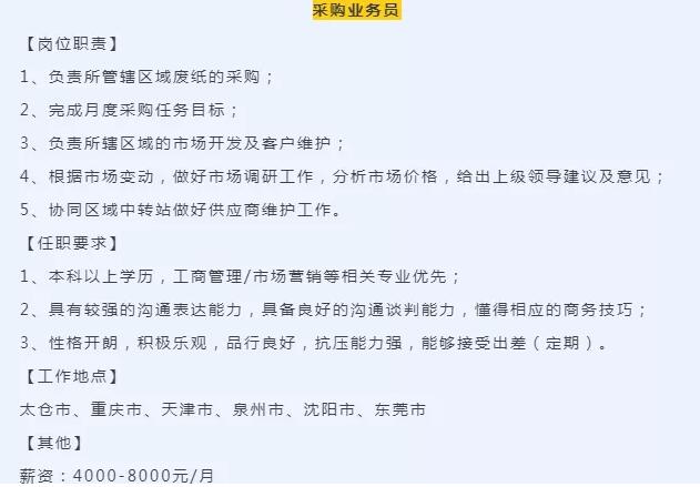 玖龍?jiān)谀承U衅脚_(tái)發(fā)布的招聘廣告 這些中轉(zhuǎn)站背靠造紙廠終端客戶(hù)優(yōu)勢(shì),在減少中間環(huán)節(jié)的同時(shí),增加了利潤(rùn)空間,其價(jià)格競(jìng)爭(zhēng)能力普遍比一般打包站強(qiáng)。 當(dāng)然,單純依靠中轉(zhuǎn)站并不能不能完全代替其他各級(jí)廢紙回收商,在當(dāng)前各級(jí)中間回收商仍然是廢紙回收主力。然而,太倉(cāng)玖龍卻為這個(gè)行業(yè)引進(jìn)了競(jìng)爭(zhēng)因素,不僅讓中轉(zhuǎn)站和打包站等中間商競(jìng)爭(zhēng),還搞中轉(zhuǎn)站之間的內(nèi)部競(jìng)爭(zhēng)。而這個(gè)競(jìng)爭(zhēng)的“價(jià)值”我們做一個(gè)不負(fù)責(zé)任的換算,按照太倉(cāng)玖龍每天300車(chē)、每車(chē)30噸廢紙的到廠量,50元/噸差價(jià)來(lái)計(jì)算,其30天帶來(lái)的直接利益可能就是13500000的。 而且,不需要打包站做的多么出色,收購(gòu)的廢紙質(zhì)量有多好,只要中轉(zhuǎn)站還存在,其他中間商就得為其存在買(mǎi)單。 遺憾的是,在廢紙回收量大跌、國(guó)廢短缺日益明顯的時(shí)期,這種套路效果必然持續(xù)不久(6月6日起,太倉(cāng)玖龍國(guó)廢黃板紙采購(gòu)價(jià)格上調(diào))。但即使沒(méi)有競(jìng)爭(zhēng)因素,單是更多的廢紙來(lái)源,仍能通過(guò)原料渠道幫助紙廠強(qiáng)化對(duì)小紙廠的優(yōu)勢(shì)。