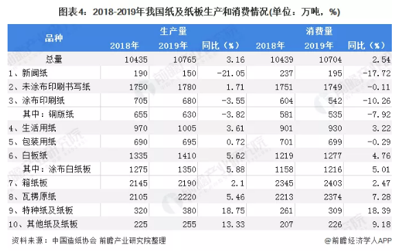 2010-2017年,我國造紙行業(yè)一直處于產(chǎn)能過剩狀態(tài)。近兩年,造紙行業(yè)經(jīng)過供給側(cè)改革,初步化解了產(chǎn)能過剩危機。 根據(jù)中國造紙協(xié)會的數(shù)據(jù)顯示,2019年我國紙及紙板生產(chǎn)企業(yè)約2700家,全國紙及紙板生產(chǎn)量為10765萬噸,較2018年增長3.16%。消費量為10704萬噸,較2018年增長2.54%。產(chǎn)銷基本處于平衡狀態(tài)。 2010-2019年,紙及紙板生產(chǎn)量年均增長率為1.68%,消費量年均增長率為1.73%。