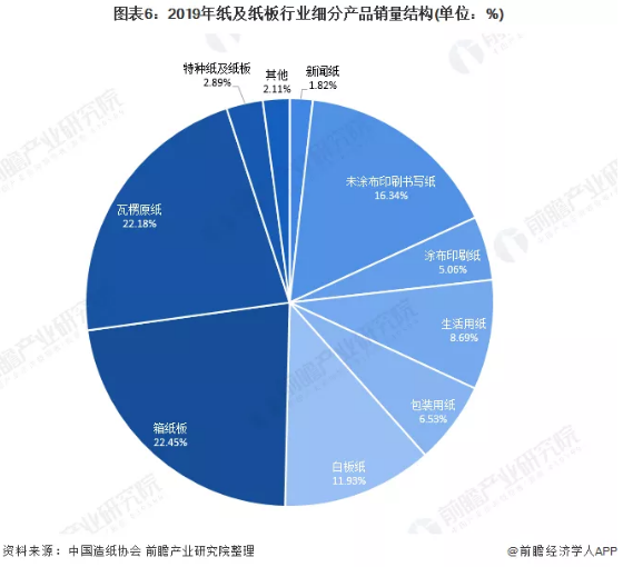 從細分品種產(chǎn)量結(jié)構(gòu)看 2019年,我國瓦楞原紙產(chǎn)量為2220萬噸,較2018年同比增長5.46%,占紙及紙板行業(yè)總產(chǎn)量的20.62%;箱紙板產(chǎn)量2190萬噸,較2018年增長2.1%,占紙及紙板行業(yè)總產(chǎn)量的20.34%;未涂布印刷書寫紙產(chǎn)量為1780萬噸,較2018年增長1.71%,占紙及紙板行業(yè)總產(chǎn)量的16.54%。