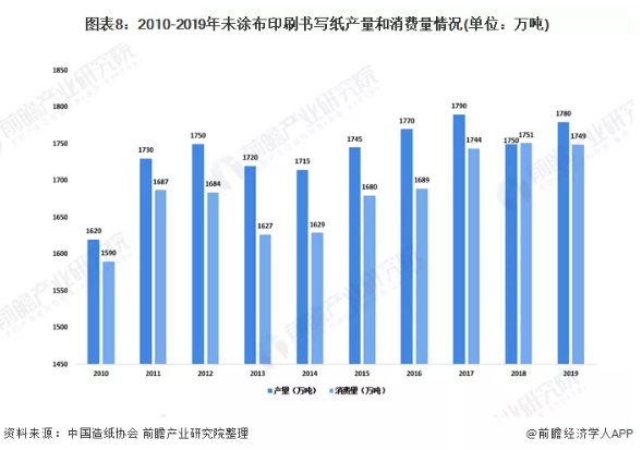 02、未涂布印刷書寫紙 2019年我國未涂布印刷書寫紙生產(chǎn)量為1780萬噸,較2018年增長1.71%;消費量為1749萬噸,較2018年下降0.11%。 2010-2019年生產(chǎn)量年均增長率為1.05%,消費量年均增長率為1.06%。