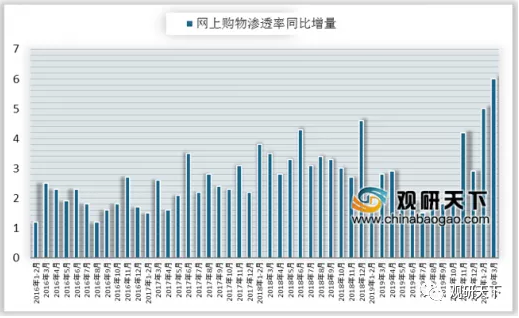 數據來源:國家郵政局 消費者在疫情期間對于線上消費意愿大幅提升,在藥品、生鮮等必須品的線上趨勢帶動下,全國網上零售額滲透率加速提升,自2016年起至今為最高增長水平,2020年3月零售額滲透率同比增速達6%。 國內網上購物滲透率同比增量 (2016年前2月-2020年3月)