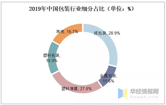 數據來源:公開資料 今年的618,各大電商平臺預售情況火爆,從天貓預售情況來看,5月25日預售開場1小時成交額同比增長高達515%,值得一提的是,同樣時限為7分鐘,消費電子類和美妝類分別突破1億、5億。 京東亦然。今年618期間,京東家電品類銷售增長強勁。6月1日開場,京東全國1.2萬家家電專賣店整體成交額已經達到去年全天的2倍,從品類來看掃地機器人和廚衛品類的成交額都同比增長超過300%。 綜合資本市場預期,電商需求仍將保持中高速增長,農村市場潛力進一步釋放,行業將呈上揚態勢,資本市場對行業發展持續看好。預計6月快遞業務量同比增速將超40%。 紙包裝業務持續一枝獨秀 無論是運輸包裝用的瓦楞紙箱、銷售包裝用的彩盒、精品盒,還是產品說明及品牌宣傳用的說明書、不干膠貼紙等,均在電商產品中占有較高的比重,電商行業的蓬勃促進了紙包裝行業發展。 隨著電商和快遞業的發展,中國的紙包裝業務收入在三種主流包裝形式(紙包裝、塑料包裝、金屬包裝)中一枝獨秀,也呈現出井噴式增長的態勢。 2019年中國包裝行業細分占比(單位:%)