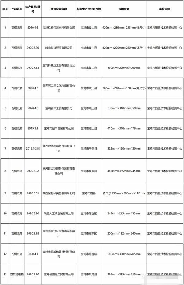 6月21日,筆者從陜西省寶雞市市場監督管理局官網獲悉,該局于2020年3月26日至5月30日對瓦楞紙箱、蘋果育果紙袋等13種產品進行了質量監督抽查,并于近日公布了監督抽查結果。 其中,在瓦楞紙箱方面,寶雞市市場監督管理局對瓦楞紙箱的耐破強度、邊壓強度、粘合強度、空箱抗壓、接合、釘合(粘合)、壓痕線、外形結構、搖蓋耐折、印刷、楞型、瓦楞紙板厚度、尺寸偏差等項目進行了檢驗。 本次所涉及的瓦楞紙箱在高新區、陳倉區、鳳翔縣、扶風縣、千陽縣、岐山縣的生產領域中抽取,共抽查紙箱生產企業13家,抽取樣品13批次,經檢驗,合格樣品13批次。具體情況如下: