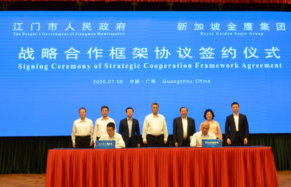7月6日下午,江門市政府與新加坡金鷹集團旗下亞太森博(廣東)紙業(yè)有限公司簽訂高達200億元的合作框架協(xié)議。廣東省委副書記、省長馬興瑞、副省長張新、省政府秘書長葉牛平、新加坡金鷹集團主席陳江和及其夫人黃瑞娥、董事陳建升等出席活動并見證簽約。