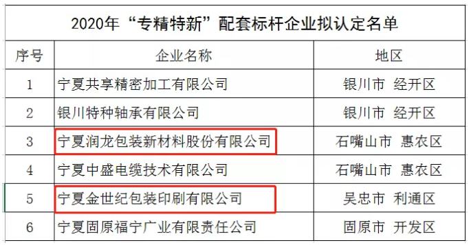 導語:6月30日,寧夏回族自治區工業和信息化廳公示了2020年自治區“專精特新”企業擬培育認定名單。其中,寧夏潤龍包裝新材料股份有限公司、寧夏金世紀包裝印刷有限公司被列入2020年“專精特新”配套標桿企業擬認定名單。另有3家包裝企業入選2020年自治區“專精特新”擬培育入庫企業名單。 1、5家包裝廠入選“專精特新”相關企業名單 按照《自治區“專精特新”企業認定管理辦法》(寧工信函〔2020〕51號)規定,經企業自主申報、縣區初審、五市中小企業主管部門和財政部門復審、自治區工業和信息化廳復核、專家評審、信用記錄查詢、實地核查、征求意見及廳黨組會議研究審定等程序,寧夏回族自治區工業和信息化廳公示了2020年自治區“專精特新”企業擬培育認定名單(公示期為2020年6月30日至7月6日)。公示的名單為: ·2020年自治區“專精特新”擬培育入庫企業名單 ·2020年自治區“專精特新”示范企業擬認定名單 ·2020年技術標桿企業擬認定名單 ·2020年成長標桿企業擬認定名單 ·2020年配套標桿企業擬認定名單 ·2020年隱形冠軍企業擬認定名單 其中,石嘴山市惠農區的寧夏潤龍包裝新材料股份有限公司,吳忠市利通區的寧夏金世紀包裝印刷有限公司被列入2020年“專精特新”配套標桿企業擬認定名單。 吳忠市利通區的吳忠市永嘉彩印包裝有限公司、吳忠市利通區的寧夏成峰包裝印刷有限公司、吳忠市青銅峽市的青銅峽市江南紅包裝制品有限公司被列入2020年自治區“專精特新”擬培育入庫企業名單。