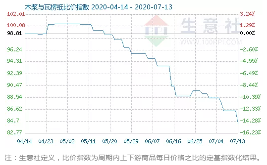 據(jù)生意社數(shù)據(jù),當(dāng)天廢紙參考價為2155.71,自2020/3/30起,106天陸續(xù)上漲了30.762%。當(dāng)天下游商品瓦楞紙參考價為3275.00,自2020/5/21起,54天陸續(xù)上漲了9.167%。 3、7月13日木漿與瓦楞紙比價指數(shù)為84.38 7月13日木漿與瓦楞紙商品比價指數(shù)為84.38,較昨日下降了1.97點,較周期內(nèi)最高點124.95點(2019-03-25)下降了32.47%,較2020年03月15日最低點76.30點上漲了10.59%。(注:周期指2017-01-01至今)注:生意社定義,比價指數(shù)為周期內(nèi)上下游商品每日價格之比的定基指數(shù)化結(jié)果。