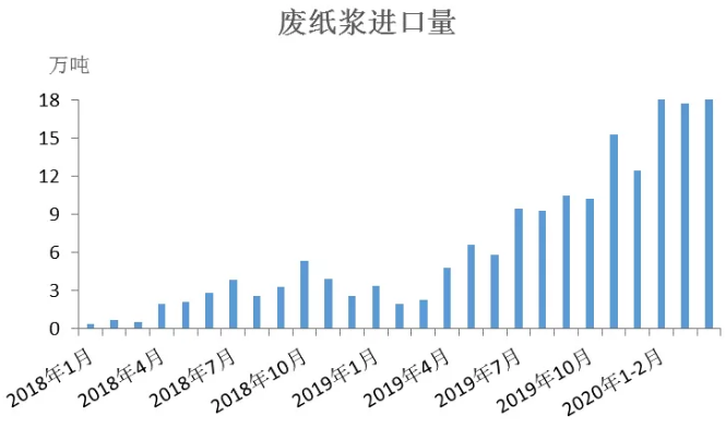 我國大規模進口廢紙漿始于2018年,當年全國共進口廢紙漿在30萬噸,到2019年,進口量增加到92萬噸。