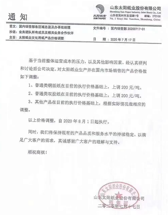 山東太陽紙業股份有限公司 基于當前整體運營成本的壓力,以及企業影響因素,經認真研判和討論后公司決定,對太陽紙業生產并在國內市場銷售的產品價格做如下調整: 1、普通類銅版紙在目前的執行價格基礎上,上調200元/噸。 2、普通類雙膠紙在目前的執行價格基礎上,上調200元/噸。 3、其他產品在目前的執行價格基礎上,根據實際情況做相應的調整。 以上價格調整,自2020年8月1日起執行。
