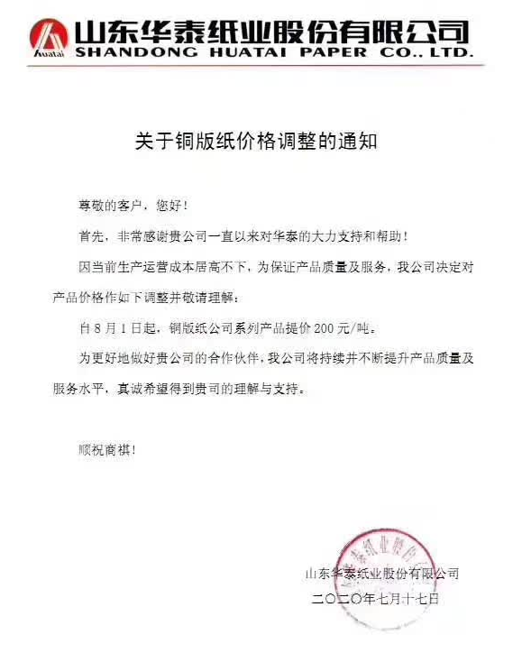 山東華泰紙業股份有限公司 因當前生產運營成本居高不下,為保證產品質量及服務,我公司決定對產品價格作如下調整把那個敬請理解: 自8月1日起,銅版紙公司系列產品提價200元/噸。