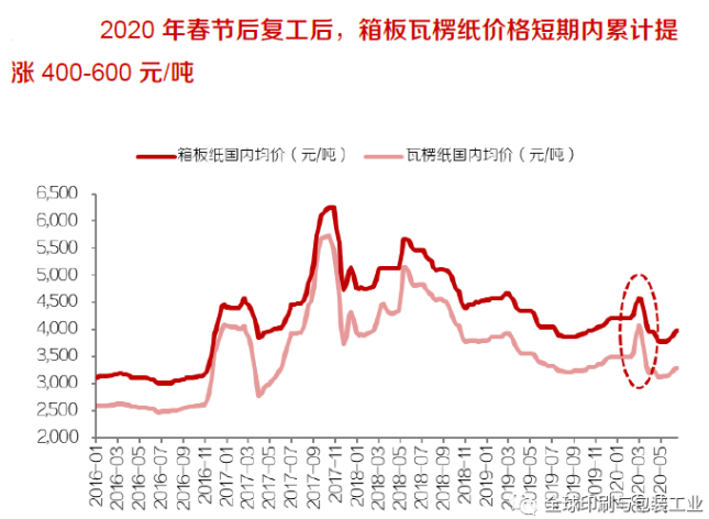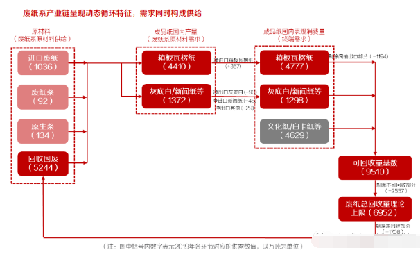眾所周知,外廢政策如期執行,預計2020底中國將基本實現外廢零進口,造紙行業原材料結構或將發生重大變化。進口廢紙作為中國造紙原材料中的重要組成部分,2016-2019 年進口廢紙占中國紙漿總消耗量的比重分別達24%、21%、16%、10%。2017年以來中國廢紙進口政策持續收緊,一系列進口廢紙相關改革措施陸續出臺,根據2018年6月24日國務院公布的《中共中央國務院關于全面加強生態環境保護堅決打好污染防治攻堅戰的意見》,2020年底中國將基本實現外廢零進口,根據目前的情況來看,預計外廢政策將如期執行。 受廢紙進口政策調整影響,2017 年至今廢紙進口量逐年收縮,2017年、2018年、2019年中國廢紙進口量分別達2572、1703、1036萬噸,同比下滑10%、34%、39%。推測2020年進口廢紙將持續減量至600萬噸,直至2020 年底基本實現零進口。假設預留新聞紙所需外廢原材料,預計2021 年及以后每年的外廢進口量將保持在200萬噸左右。未來中國造紙行業原材料結構中,進口廢紙的比重逐年減小,國廢及木漿占比有望逐步提升。 聚焦廢紙系產業鏈原材料環節,預計2020-2021年廢紙系原材料供需將整體處于緊平衡狀態,而終端需求回暖、國廢回收率受限將成為短期內打破此種平衡、促成廢紙缺口顯現的關鍵要素。進口廢紙作為廢紙系原材料供給端的重要組成部分,伴隨外廢政策如期執行,預計2021年外廢進口量相比2019年將下降836萬噸至200萬噸;由此帶來的高品質纖維缺口將由進口廢紙漿、原生漿、國廢等替代纖維填補,由于廢紙漿、原生漿布局未來投產規模有限,國廢供給量受國廢回收率制約,未來廢紙系原材料存在供給邊界,因此未來1-2年廢紙缺口會否出現將與廢紙總需求量的走向直接相關。 需求端,廢紙總需求量受箱板瓦楞紙終端需求影響較大,與經濟活動高度相關,經歷了2018年下半年終端需求顯著下滑、2019年小幅回暖后,2020年年初以來疫情對全球經濟帶來的沖擊,再一次導致廢紙系原材料總需求整體回落。站在當前時點展望未來1-2年,受進口廢紙漿、原生漿以及進口成品紙等海內外自建項目投產節奏影響,在需求端偏弱、供給端存在約束的情形下,若2020年全年箱板瓦楞紙需求相較2019年降幅在5%以內,則廢紙缺口將有望顯現;若2020年需求較弱,但2021年箱板瓦楞紙需求量相比2019年增長超過5%,則廢紙缺口亦將有望于2021年顯現。據此預計2020-2021年廢紙系原材料供需將整體處于緊平衡狀態,而終端需求回暖、國廢回收率約束將成為打破平衡、決定廢紙缺口會否顯現的關鍵變量。 未來1-2年,商品廢紙漿、國廢價格有望于需求旺季迎來上漲。終端需求變化、國廢回收率約束是決定未來1-2年廢紙缺口會否顯現的關鍵要素,整體而言: 箱板瓦楞紙需求對廢紙需求端的影響程度大于對供給端的影響,因此當終端需求回暖帶來廢紙總需求增長時,預計廢紙總供給增速將不及廢紙總需求增速,廢紙缺口將顯現,且伴隨終端需求增速提升、廢紙缺口將進一步擴大,終端需求回暖將成為加劇廢紙供需緊張的“反饋放大器”。 當廢紙供給端國廢回收率提升受限時,廢紙缺口在需求較弱的情形下仍有可能顯現,2020年春節復工后,國廢價格因供給端回收率受限導致的快速上漲即是例證。由此可見,需求回暖將是短期內打破廢紙系原材料供需緊平衡、導致廢紙缺口顯現的關鍵原因,如若國廢回收率提升受限,也將在短期內造成廢紙供需緊張的局面出現。因此,在年內需求旺季這一需求改善的窗口期,商品廢紙漿、國廢價格均有望迎來階段性上漲。 基于廢紙系產業鏈動態循環視角,需求回暖情形下,2020-2021年廢紙缺口有望出現 廢紙系產業鏈具備動態循環特征,廢紙系原材料總需求量受箱板瓦楞紙等成品紙消費量的影響發生變化,與此同時,這些成品紙又構成了廢紙系產業鏈的供給原材料,也即意味著需求同時構成供給。針對國廢總回收量上限的測算均以2019年國內紙及紙板消費量為基數,即假設2021年相比2019年需求不再下滑,由此得到2021年國廢總回收量最多達5562萬噸。然而,考慮到中國的廢紙循環周期較短(國廢價格快速上漲時,從紙箱消費到廢紙回收、再到紙箱的生產,整個過程僅需3-4個月),終端需求下滑帶來箱板瓦楞紙產量下降、廢紙總需求量下滑的同時,可用作造紙原料的國廢回收量也會相應減少,未來國廢總回收量的上限值也將相應下降。即需求影響供給。