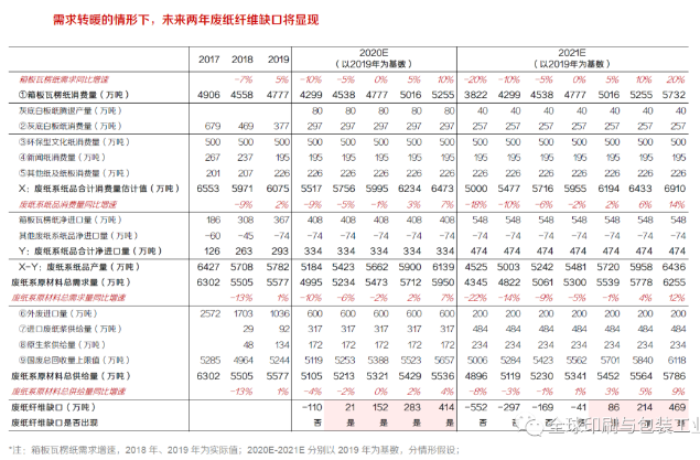 因此,后文進行未來1-2年廢紙系原材料供需預測時,國廢總回收量上限值將跟隨廢紙總需求量的變化而相應調整。考慮到文化紙、生活用紙等紙種需求相對穩定,以箱板瓦楞紙為主的包裝紙需求受宏觀經濟影響較明顯,因此在其他條件不變的情況下,我們將僅考慮箱板瓦楞紙消費量的變化,其他紙種消費量假設保持不變(其中,富陽地區灰底白板紙產能騰退的部分將由白卡紙完全替代,總量維持不變),由此計算得到各類需求增速下的國廢總回收量最大值。也即是說,基于動態循環的視角,當終端需求波動導致廢紙系原材料總需求量(后文簡稱“廢紙總需求”)變化的同時,也將影響國廢回收量上限值、進而影響廢紙系原材料總供給量的大小。 1、2020-2021年廢紙系原材料供需緊平衡,廢紙缺口將于需求回暖時顯現 預計2020-2021年廢紙系原材料供需將整體處于緊平衡狀態,廢紙缺口顯現的具體時點與需求相關。分別針對廢紙系原材料總供給和總需求進行詳細拆解: ·供給端,廢紙總供給量=外廢進口量+廢紙漿供給量+原生漿供給量+國廢回收量,伴隨進口廢紙逐年減量,廢紙漿、原生漿以及國廢作為進口廢紙的替代品,存在供給邊界。外廢政策將如期執行,2021年中國將基本實現外廢零進口,假設預留新聞紙原材料所需,預計2021年外廢進口量相比2019年將下降836萬噸至200萬噸,高品質纖維缺口亟待補充。然而,作為外廢纖維的首要補充途徑,廢紙漿主要通過海外布局實現,未來兩年預計釋放產能約360萬噸,供給相對有限;添加原生漿是紙企應對高品質纖維短缺問題的另一重要舉措,預計未來兩年原生漿將新增100萬噸供給量,供給量同樣存在約束;國廢供給量即國廢總回收量,與國廢回收水平直接相關,推測2019年國廢回收水平已達理論上限的75.4%;參考日本廢紙回收率的提升歷程,預計中國該過程也將逐步推進,假設2020年、2021年國廢回收水平將分別提升至其理論上限的77.5%、80.0%,得到各年對應的國廢回收量上限,進而得到各類需求增速下的廢紙總供給量上限。 ·需求端,廢紙總需求量=①廢紙系紙品消費量-②廢紙系紙品凈進口量。其中:①廢紙系紙品消費量受箱板瓦楞紙終端需求影響較大,考慮到疫情影響下未來需求變化不確定較高,這里以2019年箱板瓦楞紙消費量為基數,按照不同增速區間分情形假設2020-2021年箱板瓦楞消費量的大小,并假設除灰底白板紙產能騰退帶來的廢紙需求量減少外,其他廢紙系紙品需求量穩定;②廢紙系紙品凈進口量增長空間有限,2020-2021年箱板瓦楞紙凈進口量將新增約181萬噸,其余廢紙系紙品凈進口量平穩。 綜合廢紙供需端變化,我們預計未來1-2年廢紙系原材料供需將整體處于緊平衡狀態;若需求轉暖,則供需緊平衡狀態將被打破,廢紙纖維缺口將顯現: ·基于定量測算的角度,若2020年箱板瓦楞紙需求量相比2019年同比降幅小于5%,則廢紙總供給量上限值將無法滿足廢紙需求量,廢紙缺口將于2020年出現;若2020年廢紙缺口未顯現,但2021年需求回暖情形下,箱板瓦楞紙需求量相比2019年增長超過5%(即相比2020年同比增長10%以上),則廢紙總供給量上限值將無法滿足廢紙需求量,廢紙缺口最遲將于2021年出現。 ·考慮到現階段海內外疫情影響下內需消費、出口貿易尚未回暖,箱板瓦楞紙下游需求短期仍延續弱勢,預計2020年箱板瓦楞紙需求量同比增速將大概率處于負增長區間;若全球疫情控制得力、需求逐步回暖,預計2021年箱板瓦楞紙需求量同比將恢復正增長,具體幅度則取決于全球宏觀經濟的恢復程度。基于以上原因,未來1-2年廢紙系原材料供需或將整體處于緊平衡狀態,需求轉暖的情形下,廢紙纖維缺口或將顯現。