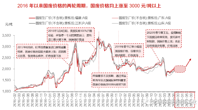 未來1-2年國廢價格有望于需求旺季迎來上漲 國廢價格走勢取決于其自身的供需關系,終端需求變化與國廢回收率是影響其供需格局的兩大關鍵要素。 ·供給端,國廢供給量即國廢總回收量,與國廢回收水平直接相關,若國廢回收率提升受限,國廢供給增速或將不及需求增速,進而導致國廢供需緊張;需求端,國廢需求量=①廢紙總需求量-②其他廢紙系原材料供給量,其中:①廢紙總需求量由國內廢紙系紙品產量直接決定,即廢紙系紙品消費量中難以被進口成品紙滿足的部分,由箱板瓦楞紙終端需求主導,受內需、出口影響程度較高,存在不確定性;②其他廢紙系原材料供給量,即進口廢紙、廢紙漿、原生漿等高品質纖維供給量之和,伴隨進口廢紙逐年減量,若廢紙漿、原生漿等高品質替代纖維供給量增加幅度不及廢紙進口量下降幅度,需求轉暖的情形下,國廢替代性需求將相應增加,或將觸及供給邊界,國廢缺口或將顯現,國廢價格即有可能上漲。 ·復盤國廢價格表現,2016年以來國廢價格的兩輪周期頂點分別出現于2017年10月、2018年5月底至7月初,供需緊張的情況下價格均上漲至3000元/噸以上。2016年以來,國廢價格兩輪顯著上漲分別出現于2017年8-10月、2018年5月底至7月初。 ·2017年8月起,旺季因素疊加進口廢紙減量預期,國廢價格出現較大幅度上漲,由8月初的2000元/噸上漲至3150元/噸,10月中下旬受終端需求下滑、廢紙貿易商去庫存等因素影響,國廢價格顯著回落。 ·國廢價格第二輪顯著上漲出現于2018年上半年,外廢進口量減少,國廢原材料需求增加,國廢價格由年初2100元/噸上漲至3300元/噸。其中,5月漲價提速主要是受到了美廢政策收緊后廢紙進口量大幅下滑的影響,加劇了國內廢紙供應緊張的局面,國廢價格快速提升。2018年6月起箱板瓦楞紙終端需求不及預期,并通過成品紙傳導至上游國廢原材料需求,進而導致國廢價格自7月初開始下跌,8月小幅上漲后繼續回落。