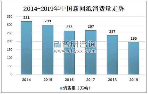 數據來源:中國海關、智研咨詢整理 3、市場需求 受下游市場消極影響,新聞紙消費量逐年下滑,但下滑速度較產量下滑速度慢,整體消費量較產量更高,新聞紙國內市場出現輕微的供不應求狀態。2018年,多家報刊停刊停辦,再加上由于報業廣告經營的下滑以及發行量下降等因素,報紙出現減張、縮版、減量的情況,致使報業新聞紙采購量繼續下降。2019年我國新聞紙消費量達到195萬噸,較2018年下滑17.72%,但較2019年產量多出30%。 2014-2019年中國新聞紙消費量走勢