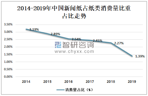 數據來源:中國造紙協會、智研咨詢整理 面對報紙用紙量減少,新聞紙市場供大于求,消費量一路走低。從2014年開始至今,新聞紙消費量占比下滑,到2019年消費量占比為1.39%。比去年消費量占比幅度減少較大。 2014-2019年中國新聞紙消費量占比走勢