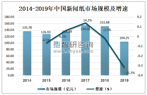 數據來源:中國造紙協會、智研咨詢整理 新聞紙市場規模從2017年開始持續下降,到2019年中國新聞紙市場規模為104.25億元,比去年下降47.43億元,同比下降31.3%。 2014-2019年中國新聞紙市場規模走勢