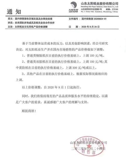 山東太陽紙業:給予當前整體運營成本的壓力,以及其他影響因素,經公司研究決定,對太陽紙業生產并在國內市場銷售的產品價格做如下調整: