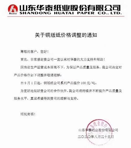 山東華泰紙業:因當前生產運營成本居高不下,為保證產品質量及服務,我公司決定對產品價格作如下調整并敬請理解:自9月1日起,銅版紙公司系列產品提價100元/噸。