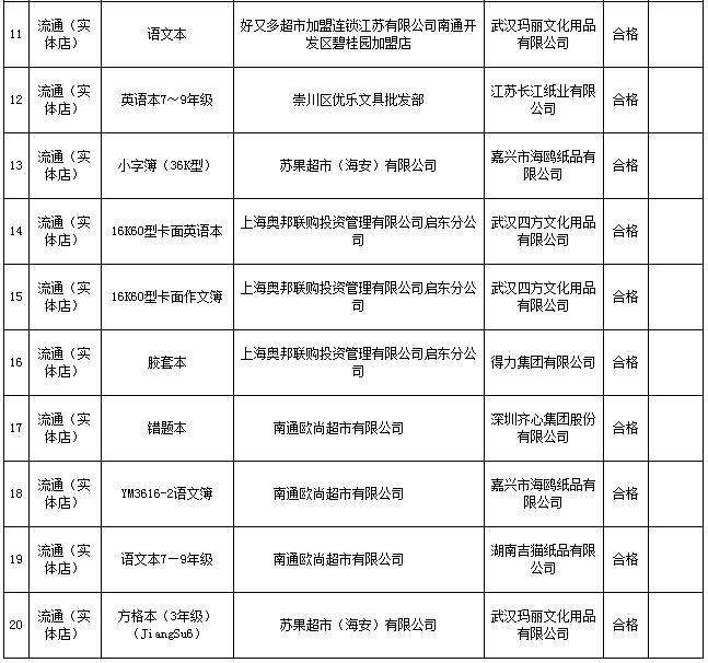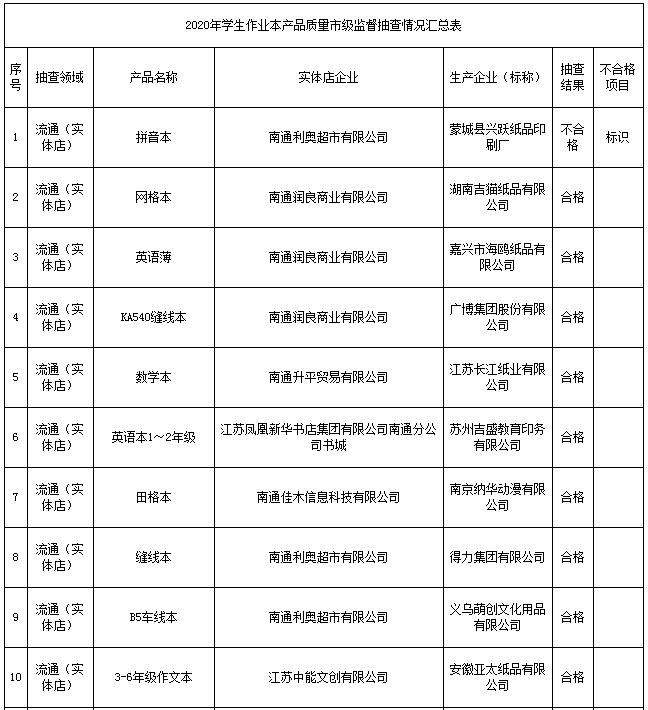 近日,江蘇省南通市市場(chǎng)監(jiān)督管理局公布2020年學(xué)生作業(yè)本、學(xué)生書(shū)包產(chǎn)品質(zhì)量市級(jí)監(jiān)督抽查情況。其中學(xué)生作業(yè)本在市場(chǎng)實(shí)體店抽查20批次,1批次不合格,合格率95%。