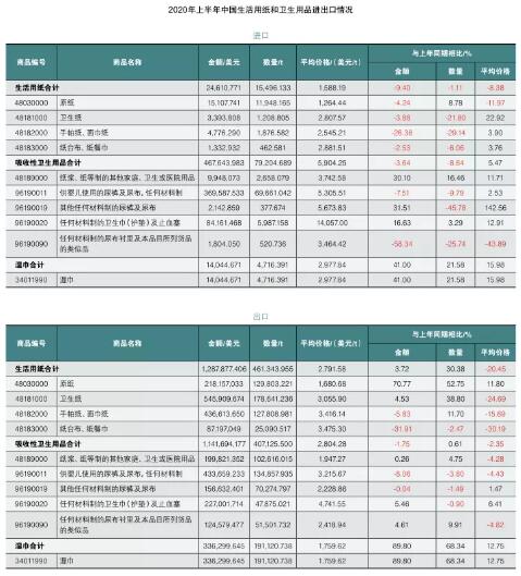 根據(jù)海關(guān)統(tǒng)計(jì)數(shù)據(jù), 2020年上半年中國(guó)生活用紙和衛(wèi)生用品進(jìn)出口情況分析如下: 生活用紙 進(jìn)口 2020年上半年, 生活用紙總進(jìn)口量約1.55萬t, 相較于2019年同期減少1.11%;總進(jìn)口額2,461萬美元, 比2019年同期 (2,716萬美元) 減少9.4%;平均進(jìn)口價(jià)格為1,588.19美元/t,比2019年同期(1,733.36美元/t)下降8.38%。進(jìn)口以原紙為主, 占生活用紙總進(jìn)口量的77.1%, 進(jìn)口量較2019年同期增加8.78%, 為1.19萬t。成品生活用紙進(jìn)口價(jià)格都有不同程度的上漲, 其中衛(wèi)生紙的平均進(jìn)口價(jià)格比2019年同期上漲22.92%。 出口 2020年上半年生活用紙總出口量大幅增長(zhǎng)30.38%,達(dá)到46.13萬t;出口額同比增長(zhǎng)3.72%, 出口產(chǎn)品的平均價(jià)格為2,791.58美元/t, 同比下降20.45%。整體呈現(xiàn)量增價(jià)跌的趨勢(shì)。生活用紙產(chǎn)品的出口量除紙臺(tái)布、 紙餐巾類小幅度下降外, 均取得了雙位數(shù)的增長(zhǎng), 其中原紙的出口量增長(zhǎng)達(dá)到52.75%, 出口總金額增長(zhǎng)70.77%, 出口單價(jià)增長(zhǎng)11.80%。成品生活用紙出口的價(jià)格都有一定程度的下降。 衛(wèi)生用品 進(jìn)口 2020年上半年, 吸收性衛(wèi)生用品總進(jìn)口量7.92萬t, 同比減少8.64%;進(jìn)口額4.68億美元, 平均價(jià)格比2019年同期提高5.47%。吸收性衛(wèi)生用品的進(jìn)口貿(mào)易整體呈現(xiàn)量減價(jià)升的趨勢(shì)。 2020年上半年嬰兒紙尿褲的進(jìn)口量同比減少9.79%, 成人紙尿褲產(chǎn)品進(jìn)口量也大幅降低45.78%, 但進(jìn)口的平均價(jià)格大幅度增長(zhǎng)142.56%。衛(wèi)生巾/衛(wèi)生護(hù)墊和止血塞類產(chǎn)品的進(jìn)口量5987.16t, 同比增長(zhǎng)了3.29%, 但增長(zhǎng)率與2019年同期相比也明顯降低。 出口 2020年上半年吸收性衛(wèi)生用品的總出口量同比微增0.61%,出口額同比減少1.75%, 平均價(jià)格比2019年同期降低2.35%。 主要產(chǎn)品種類出口量同比均有減少, 其中嬰兒紙尿褲出口量同比減少3.80%, 成人紙尿褲產(chǎn)品出口量同比減少1.49%,衛(wèi)生巾/衛(wèi)生護(hù)墊和止血塞類產(chǎn)品出口較為平穩(wěn), 出口量微減0.9%。出口產(chǎn)品以嬰兒紙尿褲為主, 占總出口量的33.12%。 濕巾 進(jìn)口 2020年上半年, 濕巾產(chǎn)品的進(jìn)口情況相較2019年同期增長(zhǎng)明顯, 進(jìn)口量同比增長(zhǎng)21.58%, 平均價(jià)格同比上升15.98%, 達(dá)到2977.84美元/t。但相比出口, 濕巾進(jìn)口總量較少, 只有出口量的2.5%。 出口 濕巾產(chǎn)品的出口量和出口額繼續(xù)保持較大幅度增長(zhǎng), 其中出口量同比增長(zhǎng)68.34%, 出口額同比增長(zhǎng)89.80%, 出口平均價(jià)格也同比上升12.75%。 2020年上半年, 受到新冠肺炎疫情影響, 中國(guó)吸收性衛(wèi)生用品進(jìn)出口業(yè)務(wù)出現(xiàn)一定程度的下滑, 特別是出口業(yè)務(wù), 增長(zhǎng)率與上年同期相比顯著降低。 得益于疫情期間對(duì)消毒和衛(wèi)生濕巾需求的大幅上升, 濕巾的進(jìn)出口業(yè)務(wù)呈現(xiàn)出強(qiáng)勁的增長(zhǎng)勢(shì)頭。