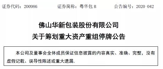 導語:9月9日,佛山華新包裝股份有限公司(以下簡稱“公司”或“粵華包B”)發布公告,公司與廣東冠豪高新技術股份有限公司(以下簡稱“冠豪高新”)正在籌劃由冠豪高新向公司全體股東發行A股股票的方式換股吸收合并粵華包B并發行A股股票募集配套資金事宜。 1、“粵華包B”要被“冠豪高新”合并了? 公告透露,本次合并預計構成《上市公司重大資產重組管理辦法(2020 年修訂)》規定的重大資產重組,亦構成公司關聯交易,本次合并不會導致公司實際控制人變更。