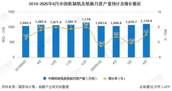 據國家統計局數據顯示,2019年全年中國機制紙及紙板(外購原紙加工除外)產量達到12515.3萬噸,累計增長3.5%。截止至2020年6月中國機制紙及紙板(外購原紙加工除外)產量為1110.9萬噸,同比增長4.1%。累計方面,2020年1-6月中國機制紙及紙板(外購原紙加工除外)累計產量達到5757.3萬噸,累計下降下降4.8%。