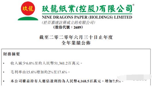 9月22日,玖龍紙業公布截至2020年6月30日止年度的業績:實現銷售收入513.41億元,同比減少6%;權益持有人應占盈利為41.68億元,同比增長7.5%。作為國內包裝紙行業龍頭企業,玖龍紙業積極擴產,未來幾年后的造紙年產能將逼近2000萬噸。