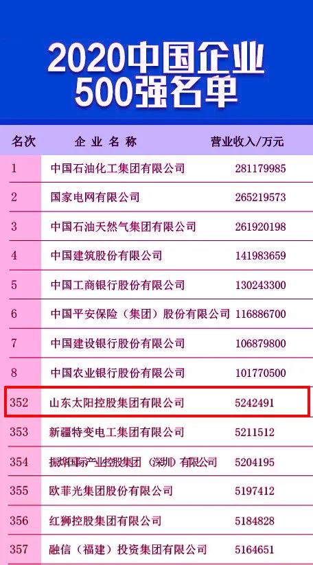 9月28日,中國企業聯合會、中國企業家協會發布“2020中國企業500強榜單”,本次上榜企業的營業收入門檻提升至359.61億元,同比提高36.36億元,企業營業收入總額為86.02萬億元,同比增長8.75%。山東太陽控股集團有限公司(以下簡稱:太陽控股集團)以524億元的營業收入榮登榜單,位列榜單第352位!