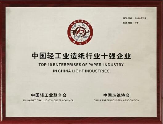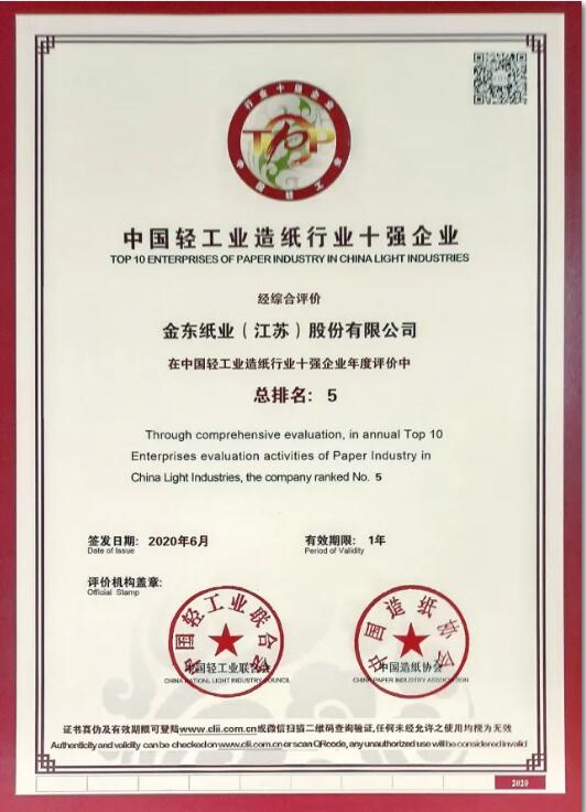 據(jù)悉,為促進造紙行業(yè)企業(yè)提高競爭力,鼓勵造紙行業(yè)現(xiàn)金企業(yè)做大做強,中國造紙協(xié)會依據(jù)中國輕工業(yè)聯(lián)合會制定的中國輕工業(yè)行業(yè)十強企業(yè)評審辦法和2019年度造紙工業(yè)發(fā)展情況,開展2019年度“中國輕工業(yè)百強企業(yè)”和各行業(yè)十強評價工作,本次金東紙業(yè)名列造紙行業(yè)十強企業(yè)第五位。