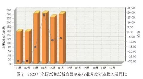 2、紙和紙板容器制造行業營業收入情況 2020年1~6月,全國紙和紙板容器制造行業累計完成主營業務收入1265.64億元,同比增長-9.45%。其中: ○ 1月份完成主營業務收入155.48億元,同比增長-27.09%; ○ 2月份完成主營業務收入155.48億元,同比增長-27.09%; ○ 3月份完成主營業務收入243.59億元,同比增長-12.68%; ○ 4月份完成主營業務收入244.14億元,同比增長20.44%; ○ 5月份完成主營業務收入226.32億元,同比增長-5.68%; ○ 6月份完成主營業務收入240. 63億元,同比增長-3.59%(見圖2)。