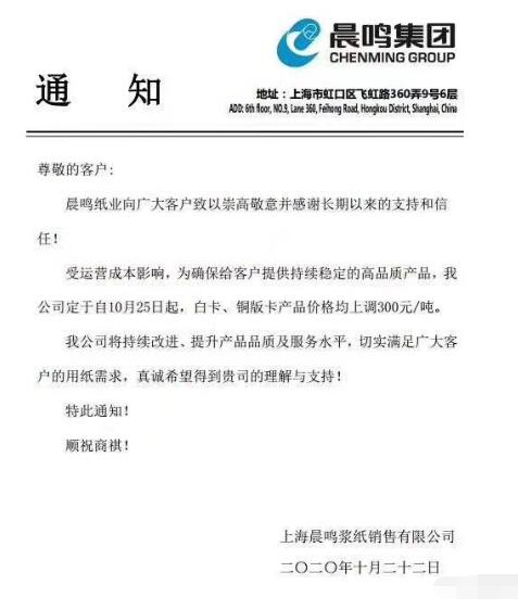 在銅版紙、雙膠紙、復(fù)印紙、白板紙、特種紙相繼發(fā)出11月漲價(jià)函之后,原本是漲價(jià)大軍的“帶頭大哥”白卡紙的漲價(jià)函,終于雖遲但到。 10月22日,白卡紙BIG4同時(shí)默契地發(fā)布了漲價(jià)通知,300元/噸的漲價(jià)幅度與文化紙相同,但比起前兩個(gè)月500元/噸的漲價(jià)幅度已有所收窄。 APP:11月1日起,針對寧波中華紙業(yè)有限公司/寧波亞洲漿紙業(yè)有限公司和廣西金桂漿紙業(yè)有限公司生產(chǎn)的所有產(chǎn)品漲價(jià)300元/噸。