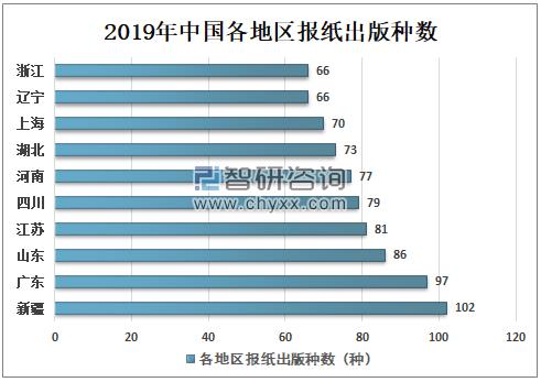 資料來源:中國統計年鑒、智研咨詢整理 中國報紙出版種數排名前三的地區是新疆、廣東、山東,其中新疆報業依靠獨特的地域優勢、準確的市場定位、成功的營銷策劃為新疆傳媒業的建設和發展。2019年新疆報紙出版種數102種,居全國第一;其次是廣東、山東,報紙出版種數分別是97、86種。 2019年中國各地區報紙出版種數