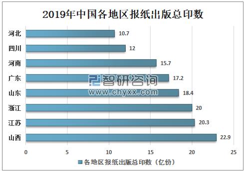 資料來源:中國統計年鑒、智研咨詢整理 中國報紙出版總印數排名前三的地區是山西、江蘇、浙江,其中山西省報刊導向正確、把握有力、運行態勢平穩。2019年山西報紙出版總印數22.9億份,居全國第一;其次是江蘇、浙江省,報紙出版總印數分別是20.3億份、20億份。 2019年中國各地區報紙出版總印數