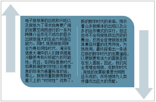 資料來源:中國統計年鑒、智研咨詢整理 二、報紙發展前景 報紙發展的歷史、現狀及其相對的生存優勢證明,報紙的生存力量是強大的。至少在-定時間里,紙質報紙還不會消亡。報紙正生活在一個完全不同的、多樣化的媒介世界中。讀者會根據自己的要求和喜好作出相應的選擇和判斷。 中國報紙行業發展前景