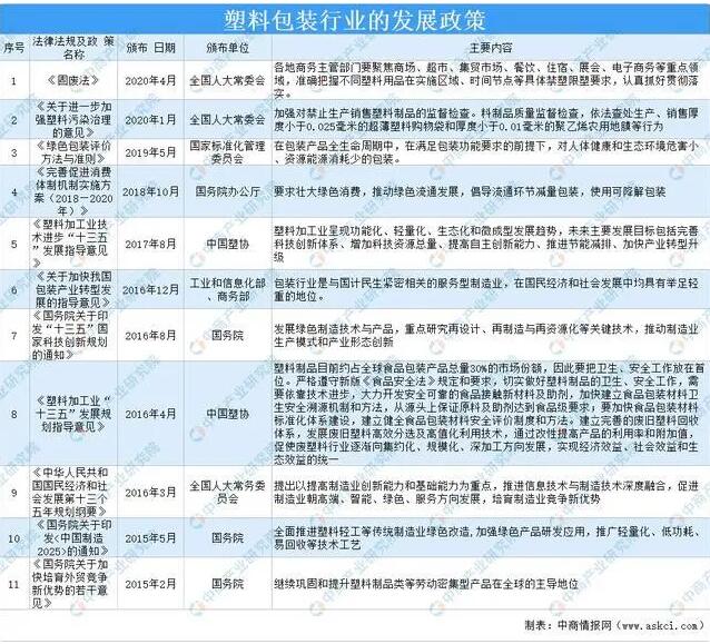 塑料包裝行業(yè)是全球性的、持續(xù)發(fā)展壯大的產(chǎn)業(yè)。伴隨著世界經(jīng)濟(jì)的恢復(fù)和現(xiàn)代商業(yè)、物流產(chǎn)業(yè)的快速發(fā)展,二十世紀(jì)中期以來包裝產(chǎn)業(yè)迅速在全球崛起。由于具備保護(hù)商品、便于流通、方便消費(fèi)、促進(jìn)銷售和提升附加值等多重功能,包裝產(chǎn)品在現(xiàn)代社會(huì)得到越來越廣泛的應(yīng)用,已成為商品流通中不可或缺的組成部分。 。ㄒ唬┧芰习b行業(yè)定義 塑料包裝是指用塑料包裝。塑料是以合成或天然的高分子樹脂為主要材料。添加各種助劑后,在一定的溫度和壓力下具有延展性,冷卻后可以固定其形狀的一類材料。 (二)塑料包裝行業(yè)相關(guān)政策 伴隨著中國經(jīng)濟(jì)取得重大成就和現(xiàn)代商業(yè)、物流產(chǎn)業(yè)的快速發(fā)展,二十世紀(jì)中期以來塑料包裝產(chǎn)業(yè)迅速在中國崛起。對(duì)此我國也出臺(tái)了相關(guān)政策規(guī)范行業(yè)發(fā)展。