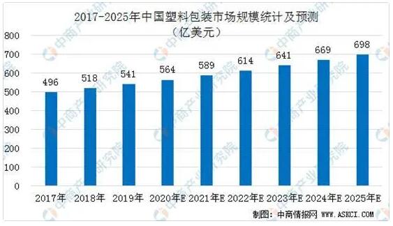 數(shù)據(jù)來源:中商產(chǎn)業(yè)研究院整理 。ㄋ模┧芰习b市場規(guī)模 數(shù)據(jù)顯示,2017年中國塑料包裝市場市場規(guī)模為496.4億美元,預(yù)計(jì)到2025年年均復(fù)合增長率為4.4%。2020年全國塑料包裝市場規(guī)模預(yù)計(jì)為564億美元。