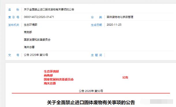 11月25日,生態環境部、商務部、國家發展和改革委員會、海關總署發布《關于全面禁止進口固體廢物有關事項的公告》(下稱《公告》)稱,禁止以任何方式進口固體廢物。公告自2021年1月1日起施行。 《中華人民共和國固體廢物污染環境防治法》于2020年4月29日,已由第十三屆全國人民代表大會常務委員會第十七次會議修訂通過,自2020年9月1日起施行。為貫徹落實《中華人民共和國固體廢物污染環境防治法》有關固體廢物進口管理的修訂內容,做好相關銜接工作,現將有關事項公告如下。 一、禁止以任何方式進口固體廢物。禁止我國境外的固體廢物進境傾倒、堆放、處置。 二、生態環境部停止受理和審批限制進口類可用作原料的固體廢物進口許可證的申請;2020年已發放的限制進口類可用作原料的固體廢物進口許可證,應當在證書載明的2020年有效期內使用,逾期自行失效。 三、海關特殊監管區域和保稅監管場所(包括保稅區、綜合保稅區等海關特殊監管區域和保稅物流中心(A/B型)、保稅倉庫等保稅監管場所)內單位產生的未復運出境的固體廢物,按照國內固體廢物相關規定進行管理。需出區進行貯存、利用或者處置的,應向所在地海關特殊監管區域和保稅監管場所地方政府行政管理部門辦理相關手續,海關不再驗核相關批件。 四、海關特殊監管區域和保稅監管場所外開展保稅維修和再制造業務單位生產作業過程中產生的未復運出境的固體廢物,參照第三款規定執行。 本公告自2021年1月1日起施行。原環境保護部、海關總署、原質檢總局辦公廳《關于加強固體廢物進口管理和執法信息共享的通知》(環辦〔2011〕141號),原環境保護部、發展改革委、商務部、海關總署、原質檢總局2015年第69號公告,原環境保護部、商務部、發展改革委、海關總署、原質檢總局2017年第39號公告,生態環境部、商務部、發展改革委、海關總署2018年第6號公告,生態環境部、商務部、發展改革委、海關總署2018年第68號公告同時廢止。 截至目前,今年共審批進口廢紙合計總量674.8740萬噸,前九個月累計實際進口448萬噸,結合目前的海運狀況和國外形勢,許可證中的一部分廢紙將無法在年內完成入關,只能作廢。