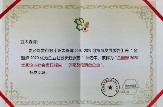 “金蜜蜂中國企業(yè)社會責(zé)任報告榜”是中國最具權(quán)威性的社會責(zé)任報告評估榜單之一,已經(jīng)連續(xù)發(fā)布13年,累計評估報告1.5萬余份,近250家企業(yè)的700余份報告上榜,成為全面展示優(yōu)秀企業(yè)社會責(zé)任報告及企業(yè)的專業(yè)平臺。本次主辦方對《亞太森博2018-2019可持續(xù)發(fā)展報告》作了如下評價:報告圍繞“開發(fā)永續(xù)資源,創(chuàng)造美好生活”的宗旨,披露亞太森博貫徹“保護(hù)環(huán)境,為客戶創(chuàng)造價值,實(shí)現(xiàn)利民、利國、利業(yè)”可持續(xù)發(fā)展理念的生動實(shí)踐,系統(tǒng)呈現(xiàn)了公司為利益相關(guān)方創(chuàng)造價值、促進(jìn)經(jīng)濟(jì)發(fā)展、環(huán)境保護(hù)、促進(jìn)社會包容性發(fā)展等方面的舉措和成效,是外資企業(yè)社會責(zé)任報告的典范。