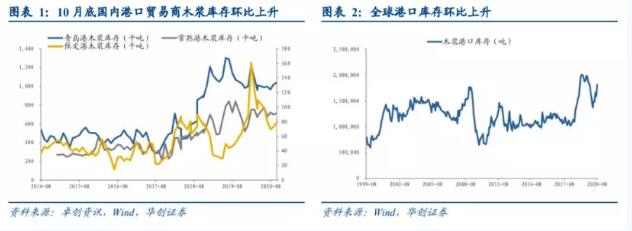 國內(nèi)港口木漿庫存環(huán)比上升,國內(nèi)外現(xiàn)貨價格價差縮小 截至2020年10月底,青島港、保定港和常熟港木漿庫存分別上升2.2萬噸、0.62萬噸和1.6萬噸至104.2萬噸、7.94萬噸和71.5萬噸,環(huán)比分別上升2.16%、8.53%和2.29%。截至2020年8月底,全球港口木漿庫存環(huán)比上升22.96萬噸至181.79萬噸,漲幅12.63%。