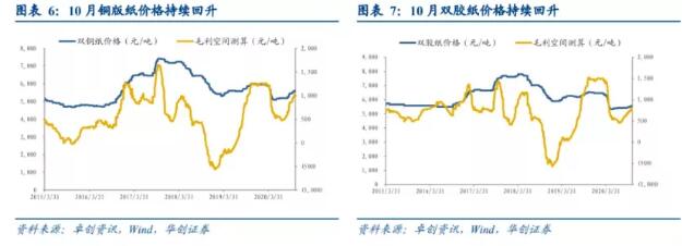 截至2020年11月2日,針葉漿外盤平均價格為620美/噸,折合人民幣4154.00,環(huán)比上升0.28%,同比上升0.13%;闊葉漿外盤平均價格為465.00美/噸,折合人民幣3115.50,環(huán)比上升1.99%,同比下降7.91%。 雙膠庫存上升,銅板庫存下降,價格上升,白卡紙市場10月表現(xiàn)持續(xù)改善。 截至2020年11月2日,銅版紙價格環(huán)比回升90/噸至5560/噸,雙膠紙價格環(huán)比回升25/噸至5512.5/噸;白卡紙價格為6614.29/噸,環(huán)比上漲0.71%,同比上漲16.40%。