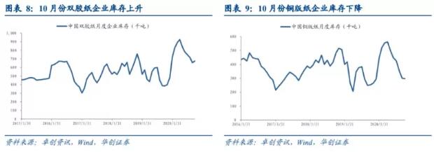 進入2019年8月以來,企業(yè)去化庫存導致箱板紙和瓦楞紙庫存量環(huán)比開始減少,1-3月庫存受春節(jié)和疫情影響波動上升,10月受消費旺季拉動下游包裝廠采購積極性,紙廠庫存天數(shù)有所下降,10月底箱板紙廠商和社會庫存分別為84.2萬和168.4萬噸,環(huán)比分別下降15.8%和上升21.24%,同比分別上升22.56%和81.47%;瓦楞紙廠商和社會庫存分別為53.8萬和107.5萬噸,環(huán)比分別下降16.07%和上升22.44%,同比分別上升33.50%和95.10%。
