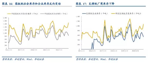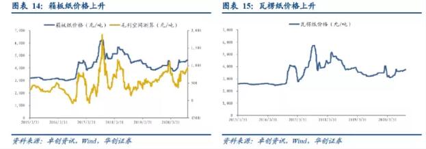 企業(yè)庫存和社會庫存一降一升,箱板紙和瓦楞紙價格持續(xù)回升。 截至2020年11月2日,箱板紙和瓦楞紙價格分別達到4626.67/噸3732.50/噸,其中箱板紙價格環(huán)比上升2.59%,同比上升14.90%,瓦楞紙價格環(huán)比上升2.40%,同比上升12.42%。