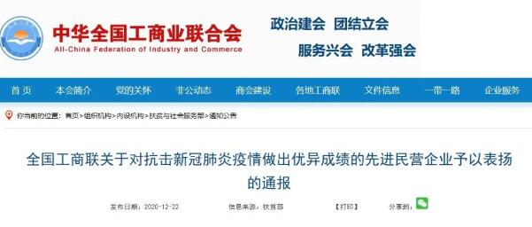 為大力弘揚在抗擊新冠肺炎疫情中形成的偉大精神,充分激發廣大民營經濟人士的責任感使命感榮譽感,廣泛凝聚眾志成城、共克時艱的強大正能量,2020年12月14日,中華全國工商業聯合會通報表揚了對抗擊新冠肺炎疫情做出優異成績的先進民營企業。
