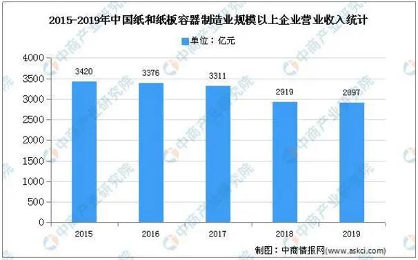 目前,我國已成為僅次于美國的全球第二大包裝大國,行業整體產值較大,但我國人均包裝消費與全球主要國家及地區相比仍然存在較大差距,因此包括工業用紙袋包裝在內的高端紙包裝領域未來將具有廣闊的市場發展空間。數據顯示,2019年,我國紙和紙板容器制造業規模以上企業實現主營業務收入2897.17億元,同比下降3.15%。