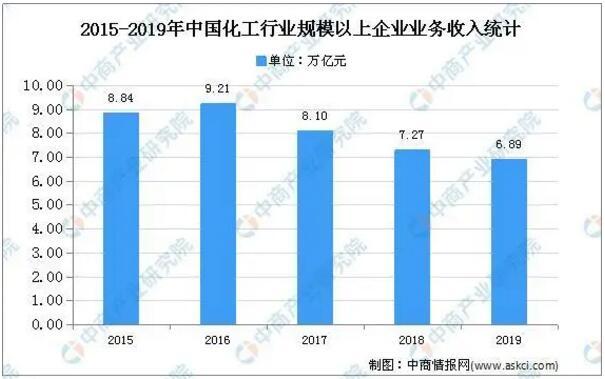 數據來源:中國包裝聯合會、中商產業研究院整理 紙包裝、塑料包裝及智能包裝系統,可應用于粉體顆粒產品、膏狀產品的包裝環節,應用領域十分廣泛。主要集中于化工、建材、食品、食品添加劑、醫藥及化妝品領域。 紙包裝行業下游應用分析 化工領域 我國是全球最為重要的化工產品生產基地之一,數據顯示,截至2019年末,化工行業規模以上企業實現主營業務收入6.89萬億元;實現利潤總額3974.4億元。隨著行業提質增效不斷加快,化工產業結構更加合理完善,行業虧損情況持續改善,盈利能力不斷增強。在化工領域,主要用于鈦白粉、初級形態塑料、合成樹脂、石墨及炭素制品等化工產品的自動包裝,其市場空間隨下游待包裝產品的發展而不斷擴大。