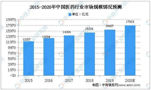 數據來源:統計局、中商產業研究院整理 醫藥領域 在醫藥領域,產品主要應用于醫藥中間體的自動化包裝,醫藥中間體主要隸屬化學藥品原料藥范疇。由于環保要求從嚴等原因,部分中小化學藥企業生產受到了影響,近兩年行業總產量出現一定程度的回調,但從長期來看,隨著我國老齡化進程加劇及人民醫療健康消費觀念的轉變,醫藥行業從長期來看具備良好的發展基礎。據預測,我國醫藥市場將會繼續保持此等增長速度,于2020年達到1.79萬億元。