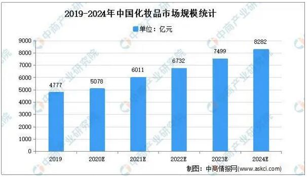 數據來源:Frost&Sullivan分析、中商產業研究院整理 化妝品類 近年來我國化妝品市場規模呈現持續穩定的增長。數據顯示,2019年我國化妝品行業整體市場容量達到4777.20億元,2014-2019年年均復合增長率9.9%,化妝品行業正處于高速增長期。預計2024年我國化妝品行業市場容量將達8282億元,2019-2024年年均復合增長率約11.6%。