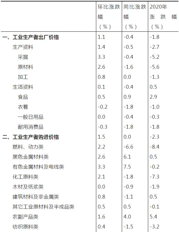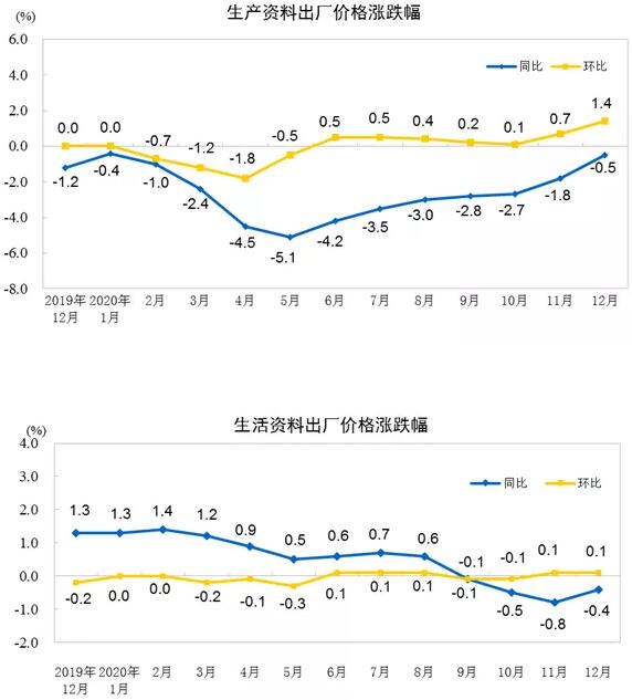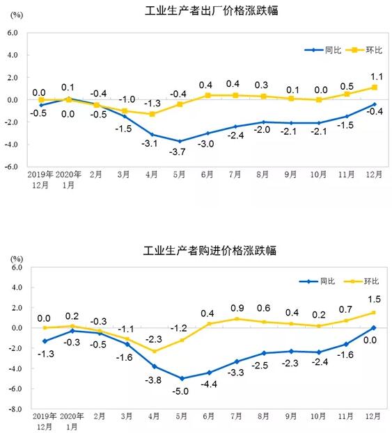 2020年12月份,全國工業(yè)生產(chǎn)者出廠價格同比下降0.4%,環(huán)比上漲1.1%;工業(yè)生產(chǎn)者購進價格同比持平,環(huán)比上漲1.5%。2020年全年,工業(yè)生產(chǎn)者出廠價格比上年下降1.8%,工業(yè)生產(chǎn)者購進價格下降2.3%。