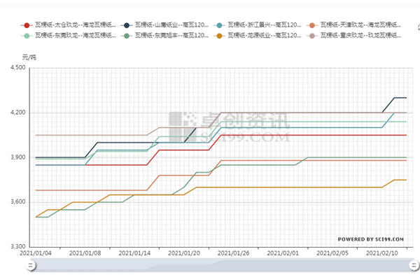 2月份瓦楞及箱板紙市場(chǎng)呈“月初拉漲—中旬假期有價(jià)無(wú)市—假期后繼續(xù)炒漲”的運(yùn)行態(tài)勢(shì),目前企業(yè)報(bào)價(jià)略顯混亂,高低價(jià)差有所拉大。節(jié)后歸來(lái),浙江、湖北、河南、廣東等地區(qū)價(jià)格調(diào)漲50-300元/噸,從下圖企業(yè)報(bào)價(jià)來(lái)看,紙廠報(bào)價(jià)均有一定程度上調(diào),市場(chǎng)對(duì)玖龍集團(tuán)2月22日調(diào)價(jià)也較為關(guān)注。