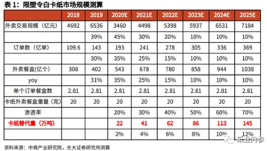 2、白卡紙漲價原因剖析,禁塑令無疑是最猛催化劑 1、原料木片采購困難,尤其針葉木片多以進(jìn)口為主,自去年底開始木片采購困難,據(jù)悉個別紙廠曾因木片采購不到位導(dǎo)致產(chǎn)線停機(jī)。 2、原料紙漿價格一路拉漲,針葉漿現(xiàn)貨價格突破7000元沖擊8000元,成本面支撐強(qiáng)勁。 3、浙江富陽地區(qū)白板紙廠1月24日左右全部停產(chǎn),部分白板紙訂單流向白卡紙企業(yè); 4、隨著禁塑令的深入推進(jìn),紙廠開始研發(fā)轉(zhuǎn)產(chǎn)無塑紙杯,同時“以紙代塑”概念下,紙品包裝備受追捧。因此規(guī)模紙企對于白卡紙行情依舊看好; 5、浙江寧波中華紙業(yè)搬遷在即,客戶將分流到其他紙廠,對2021年白卡紙供需再添利好。 白卡紙這一輪的暴漲,禁塑令無疑是其背后最猛催化劑,白卡紙?zhí)娲枨缶薮螅彩钱a(chǎn)業(yè)看好白卡紙基本面的最主要理由。 2020年,全國各省市陸續(xù)發(fā)布限塑令要求,餐飲行業(yè)首當(dāng)其沖。據(jù)光大證券測算,若2025年外賣盒白卡紙滲透率達(dá)到70%,則需要白卡紙需求量145萬噸。